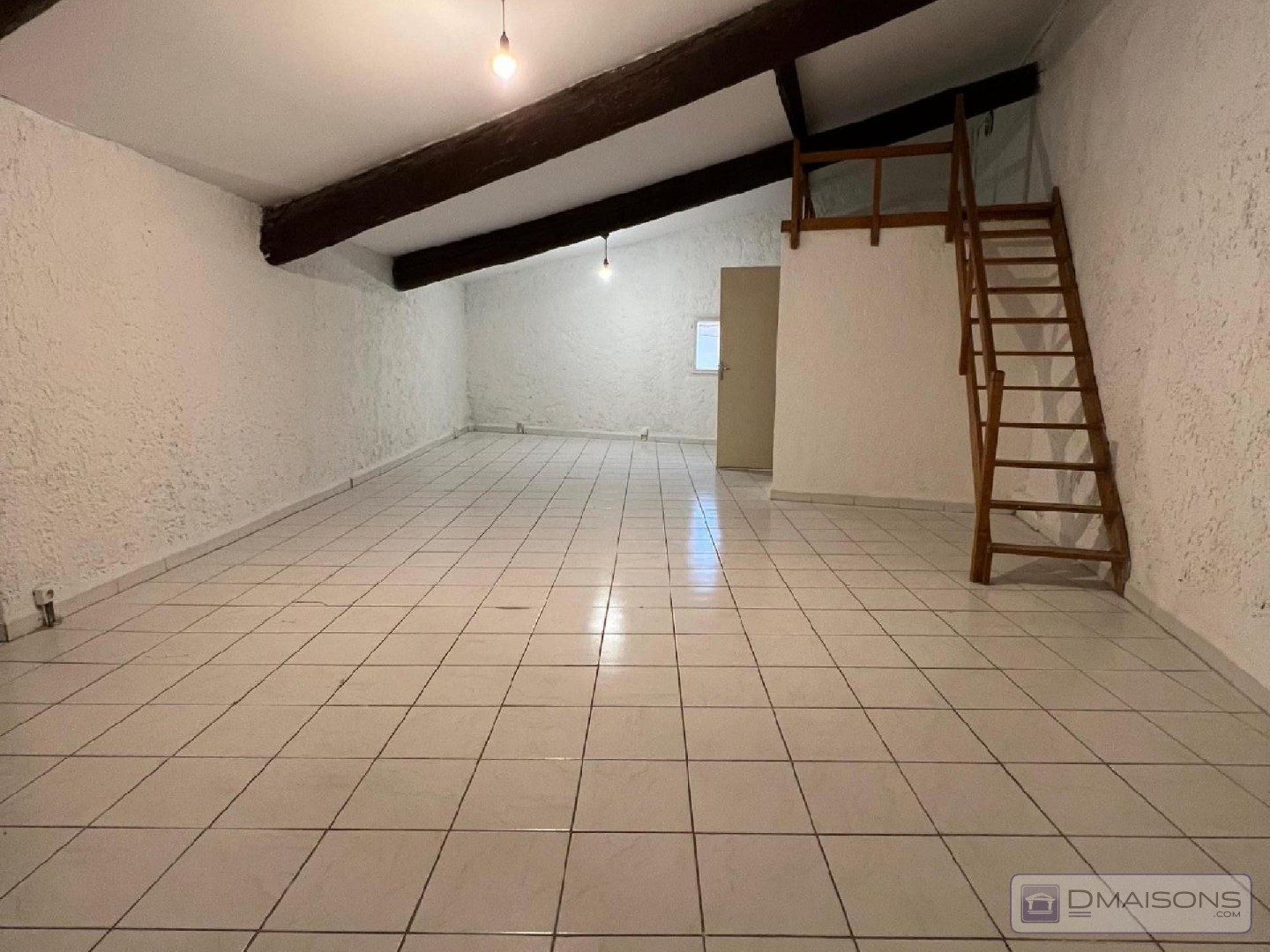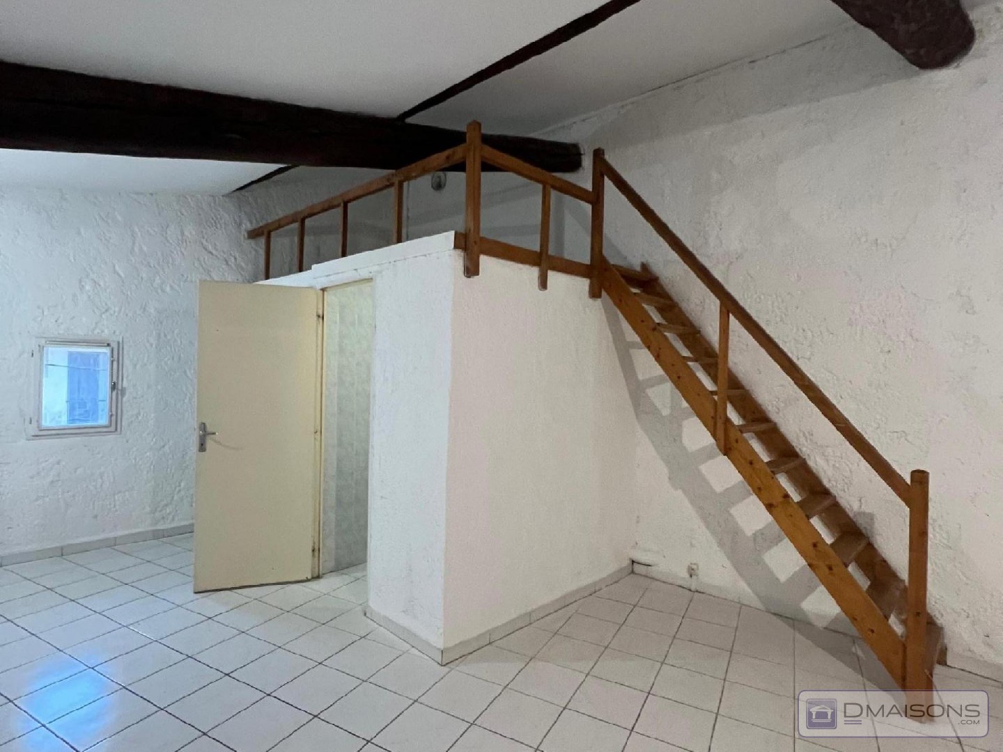 une pièce à vivre avec coin cuisine, salle d'eau, wc, mezzanine